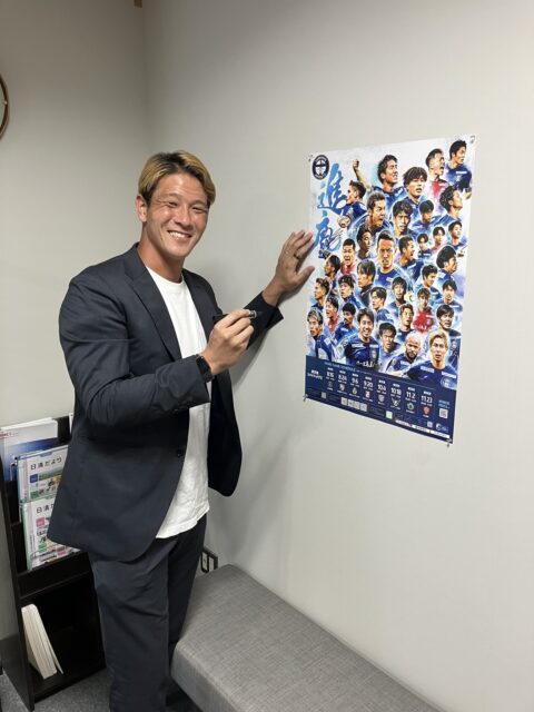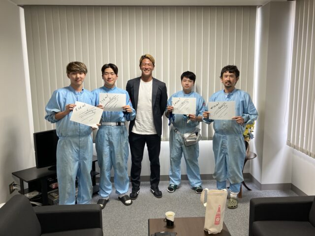 当社がオフィシャルスポンサーとして支援している、鹿児島ユナイテッドFCの藤嶋 栄介選手が2025シーズンの御礼に来社されました。当日は、記念撮影とサインに快く応じていただき従業員との交流の場となりました。